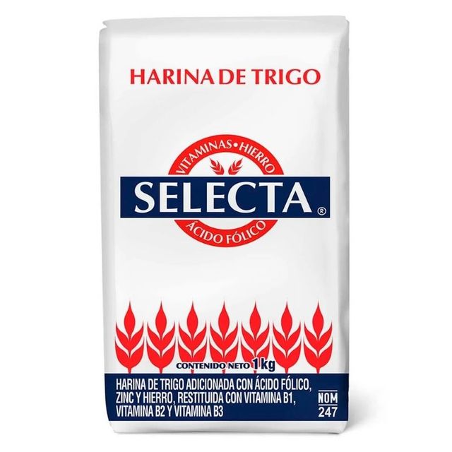 Harina de trigo adicionada con ácido fólico, zinc y hierro, restituida con vitamina B1, vitamina B2 y vitamina B3, en presentación de 1Kg